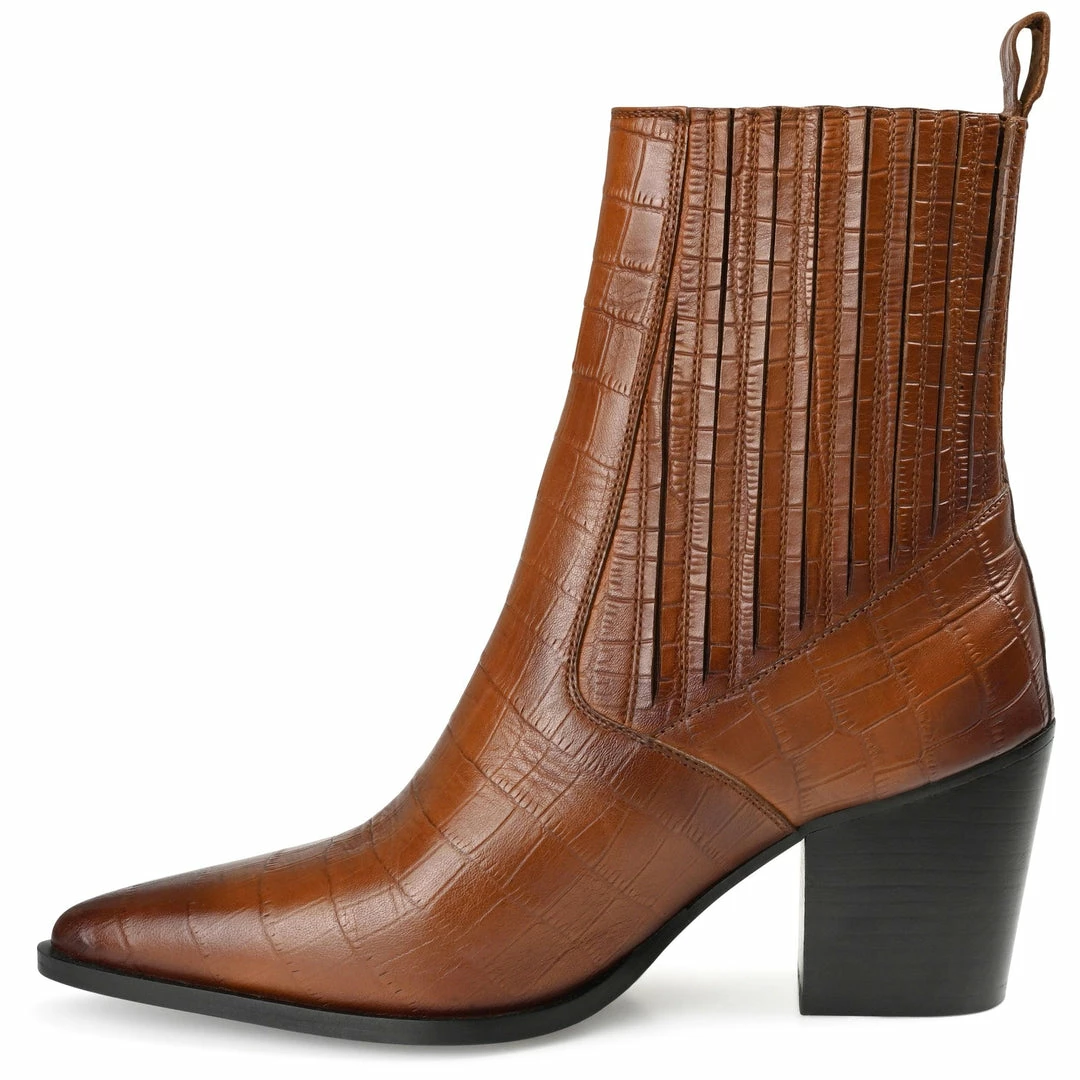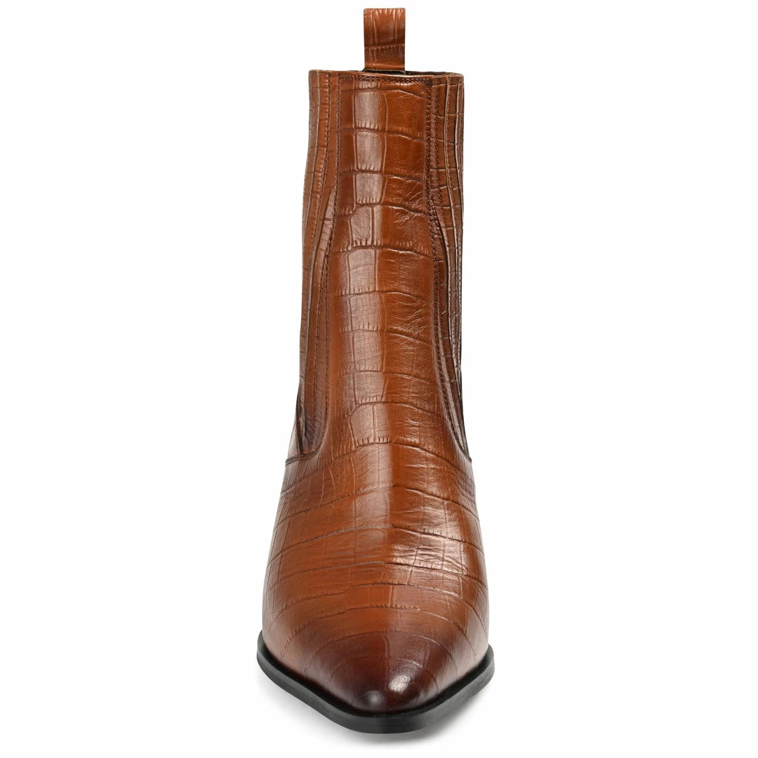 These genuine leather booties with croc texture throughout and covered stretch gore always have a point to make.